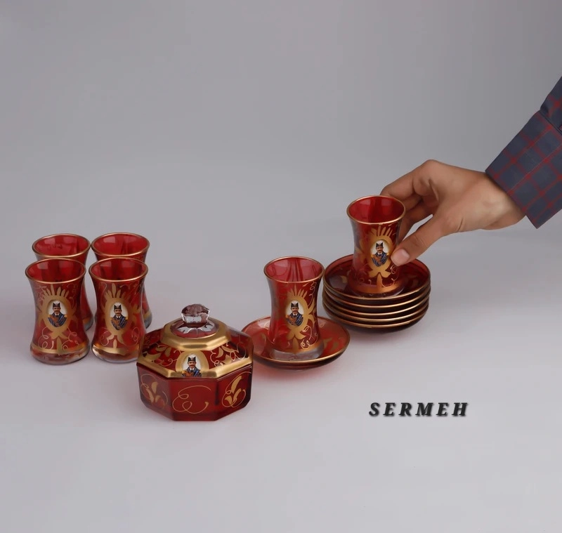 look at this wonderful Persian Shah Abbas tea set. Featuring vibrant red glass adorned with intricate gold patterns and iconic Shah Abbasi motifs, this handcrafted collection brings royal charm and cultural heritage to your tea moments. Perfect for special gatherings or as a unique gift, each piece reflects masterful artistry and a rich history.
