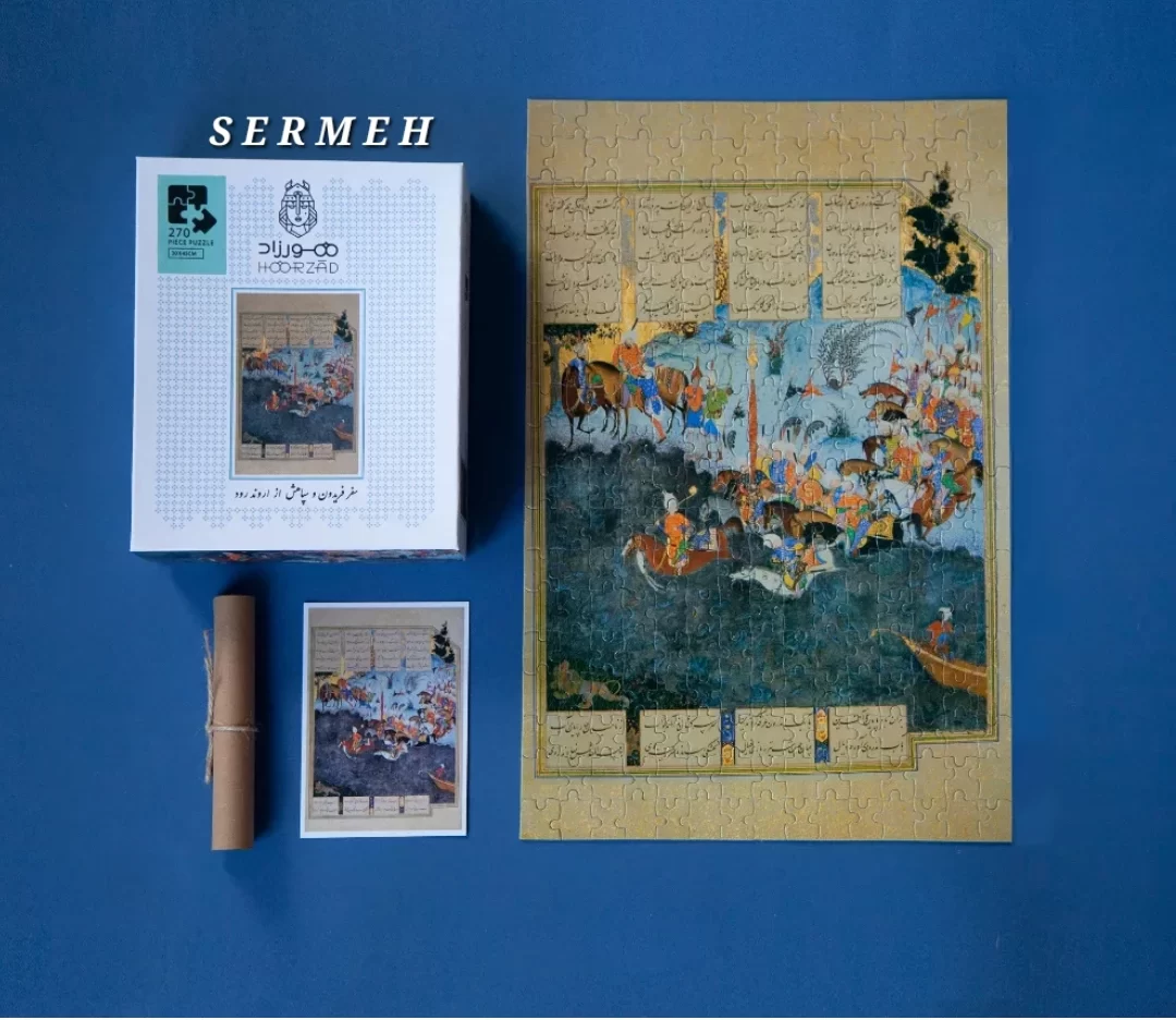 This exquisitely handcrafted puzzle brings to life the captivating story called The Journey of Fereydoun and his army from Arvandrud (سفر فریدون و سپاهش از اروند رود) from the Shahnameh, the epic Persian poem by Ferdowsi. Created by skilled artisans, each piece beautifully reflects traditional Persian artistry, allowing the heroic tales and mythical legends to resonate with vibrant detail.